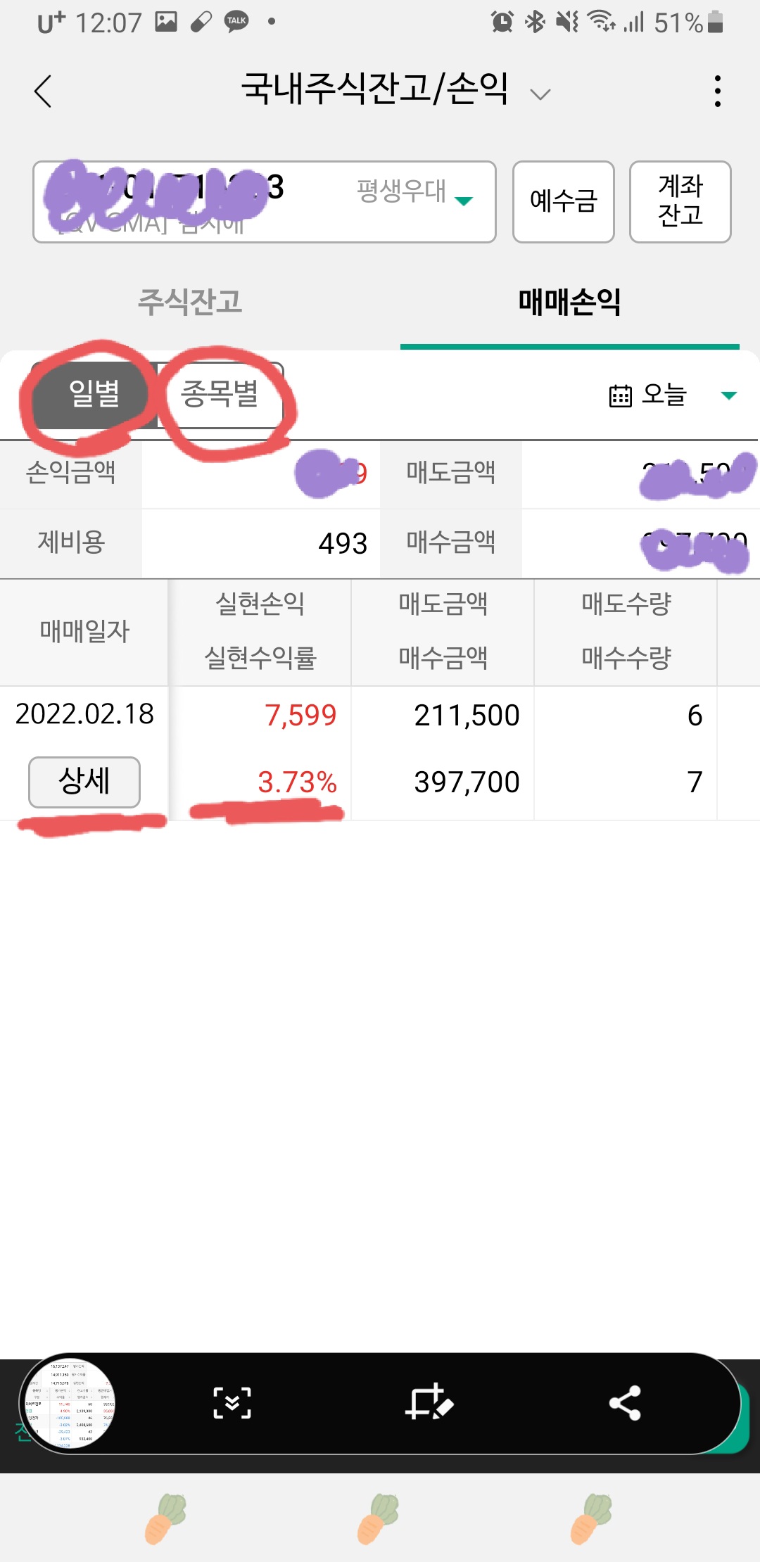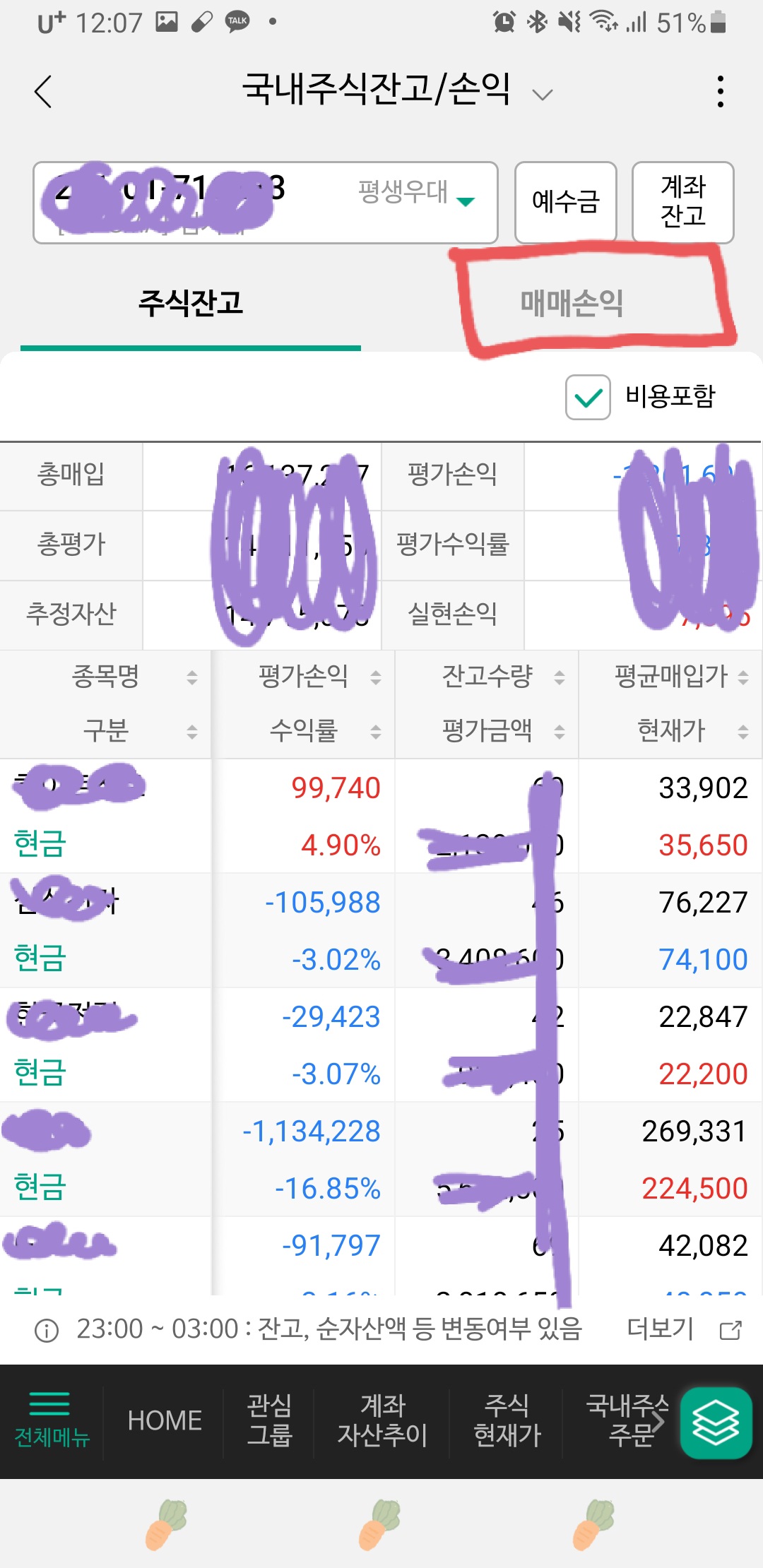 주식잔고 옆 매매손익(빨간색)