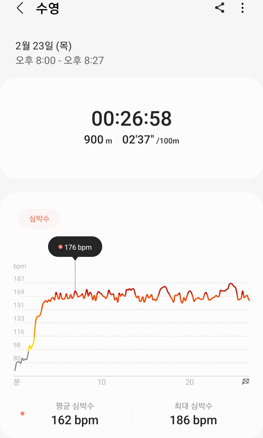 한번도 안쉬니 900m를 25분? 정도 걸린 것 같아요.