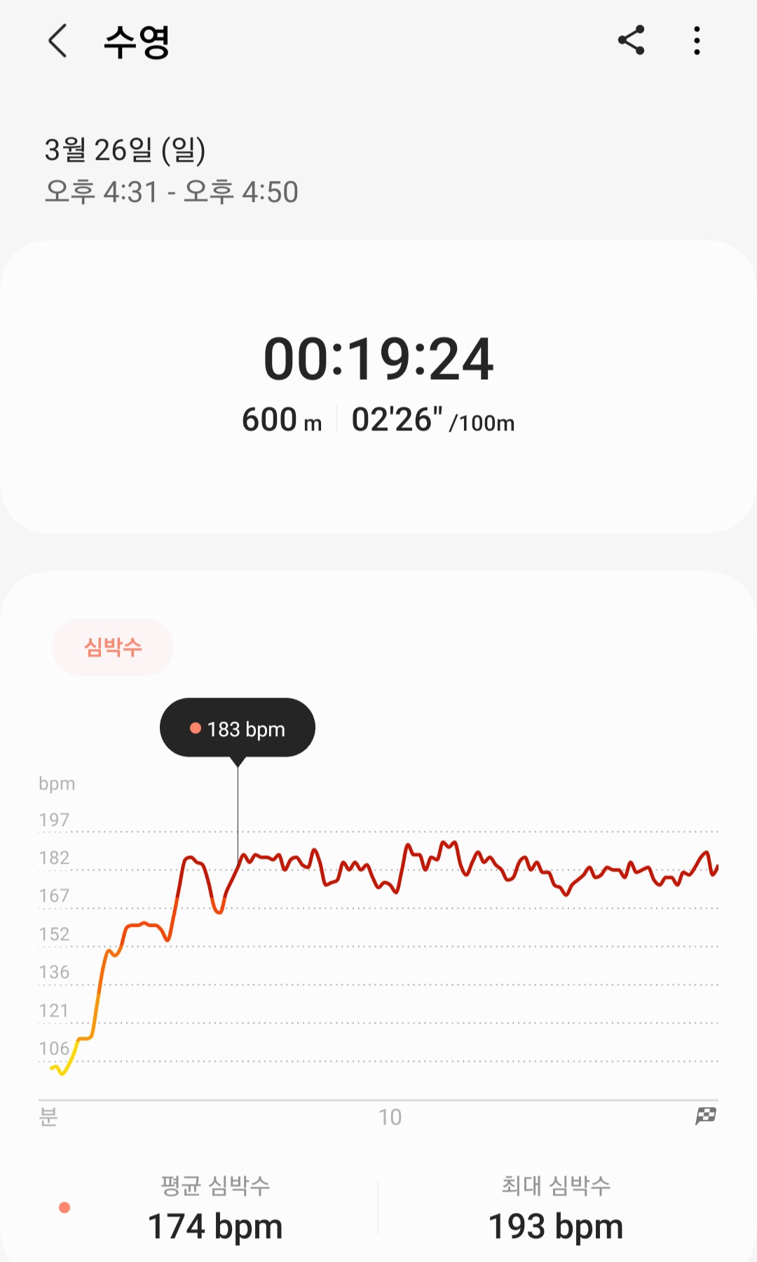어쩐지 발차기만 2바퀴하고 3바퀴째 너무 힘들다 싶더니 심박수가 장난 아니였네ㅋㅋㅋㅋㅋ