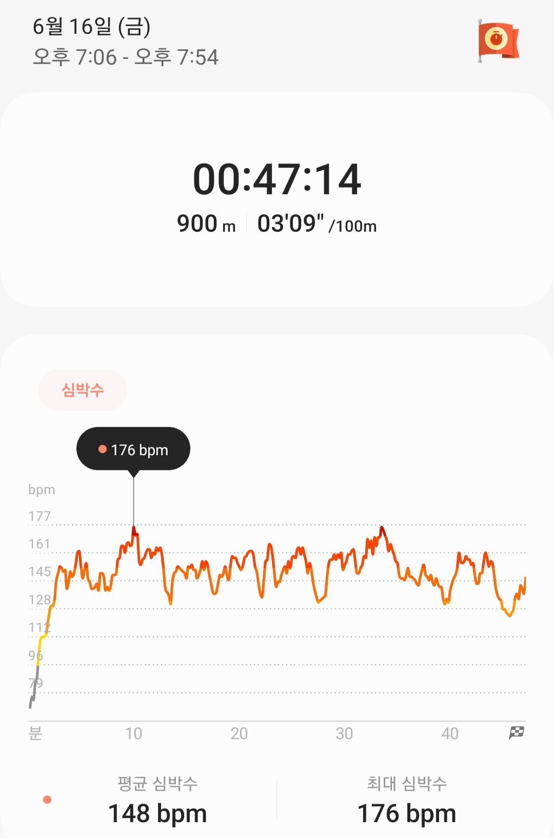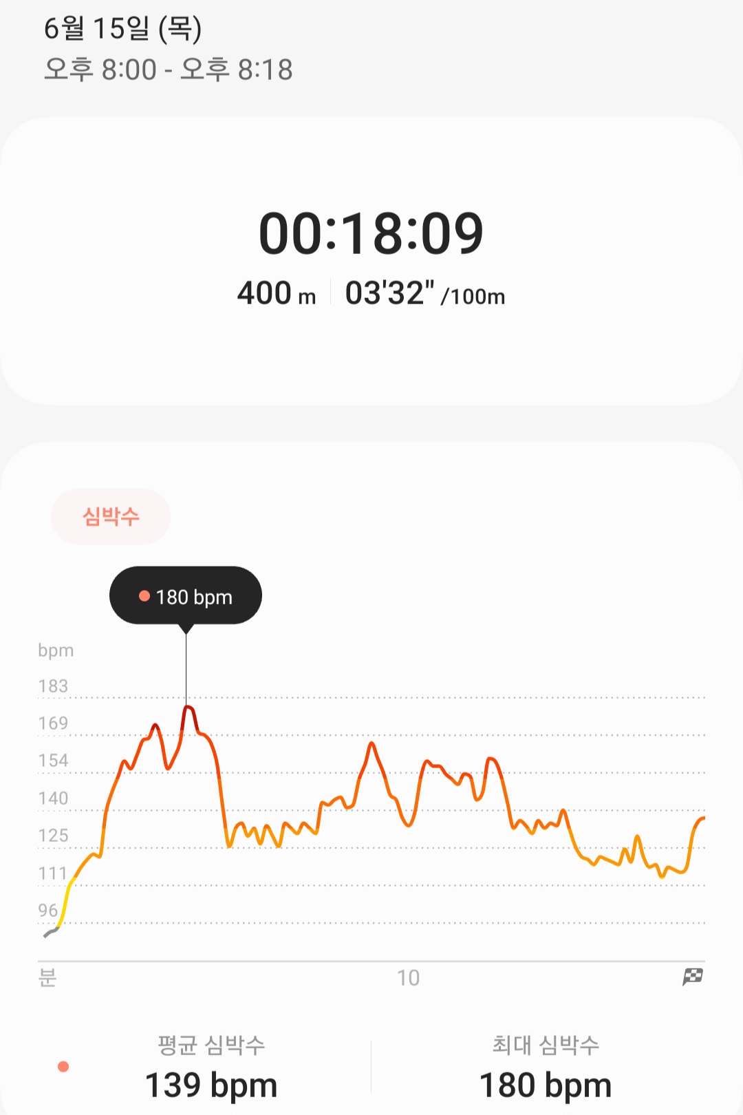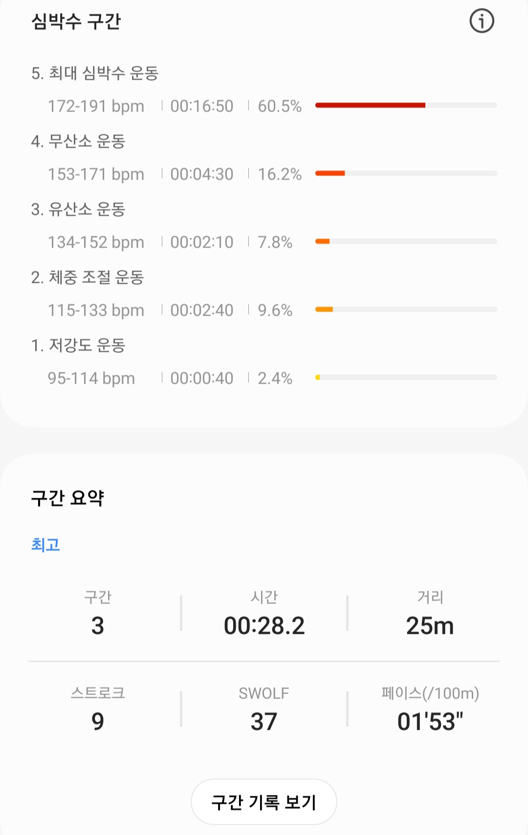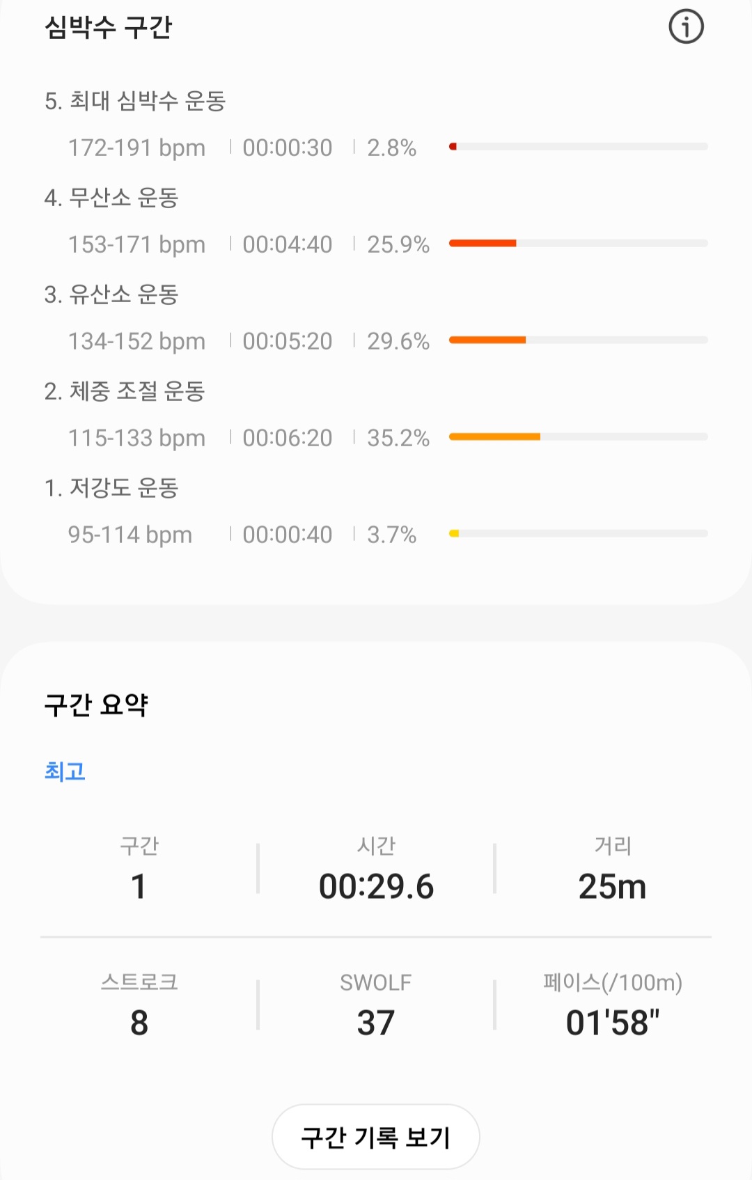 접영 몇번한것 치고는 심박수가 요동치진 않았어요