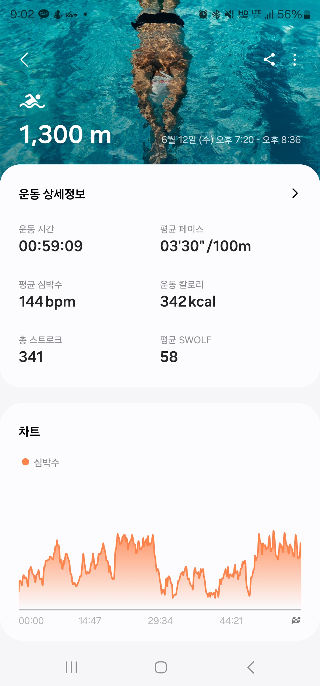 인터벌하는데 생각보다 오래 쉬었는데 운동이 접영이다보니 심박수가 생각보다 안 내려간 듯