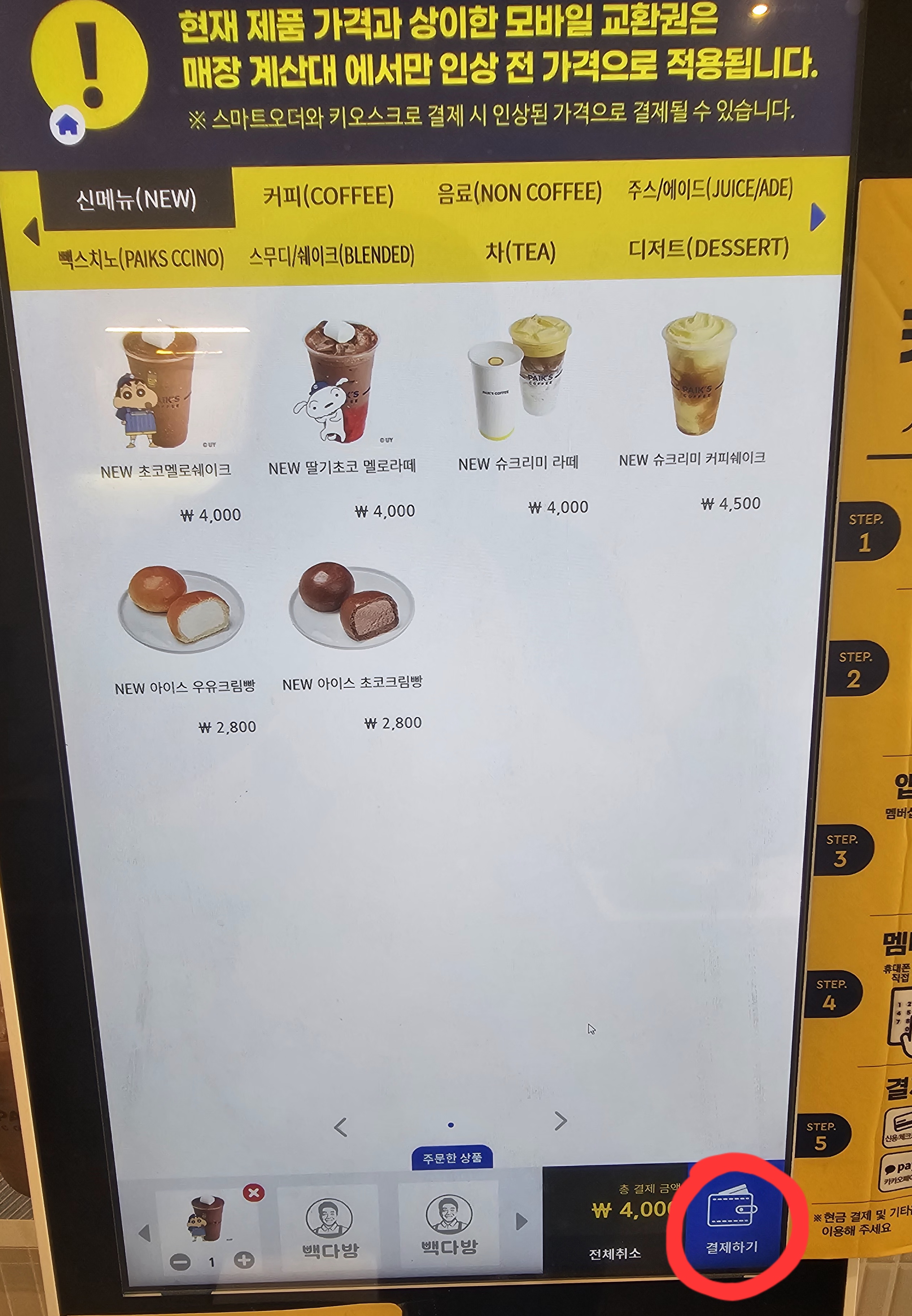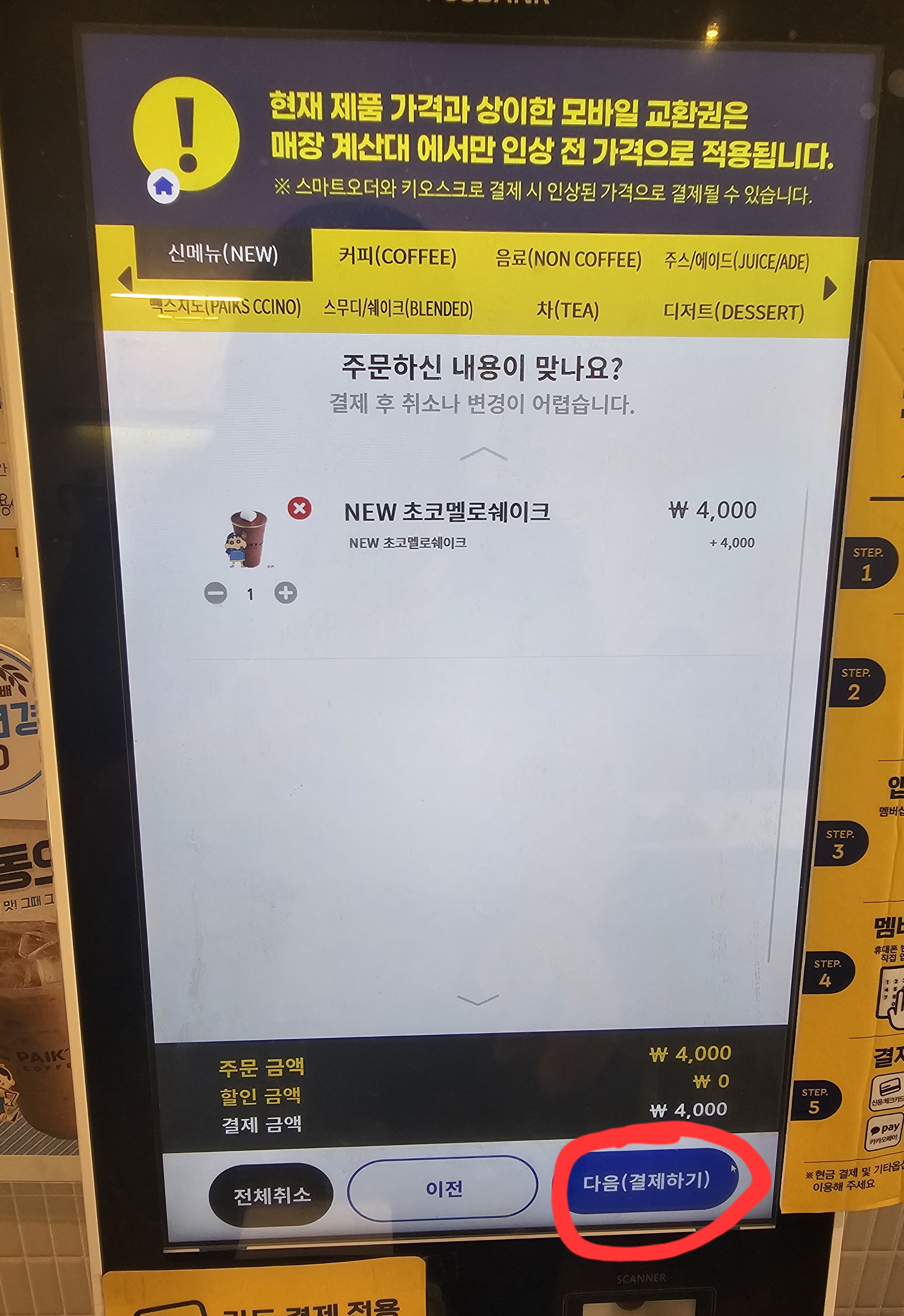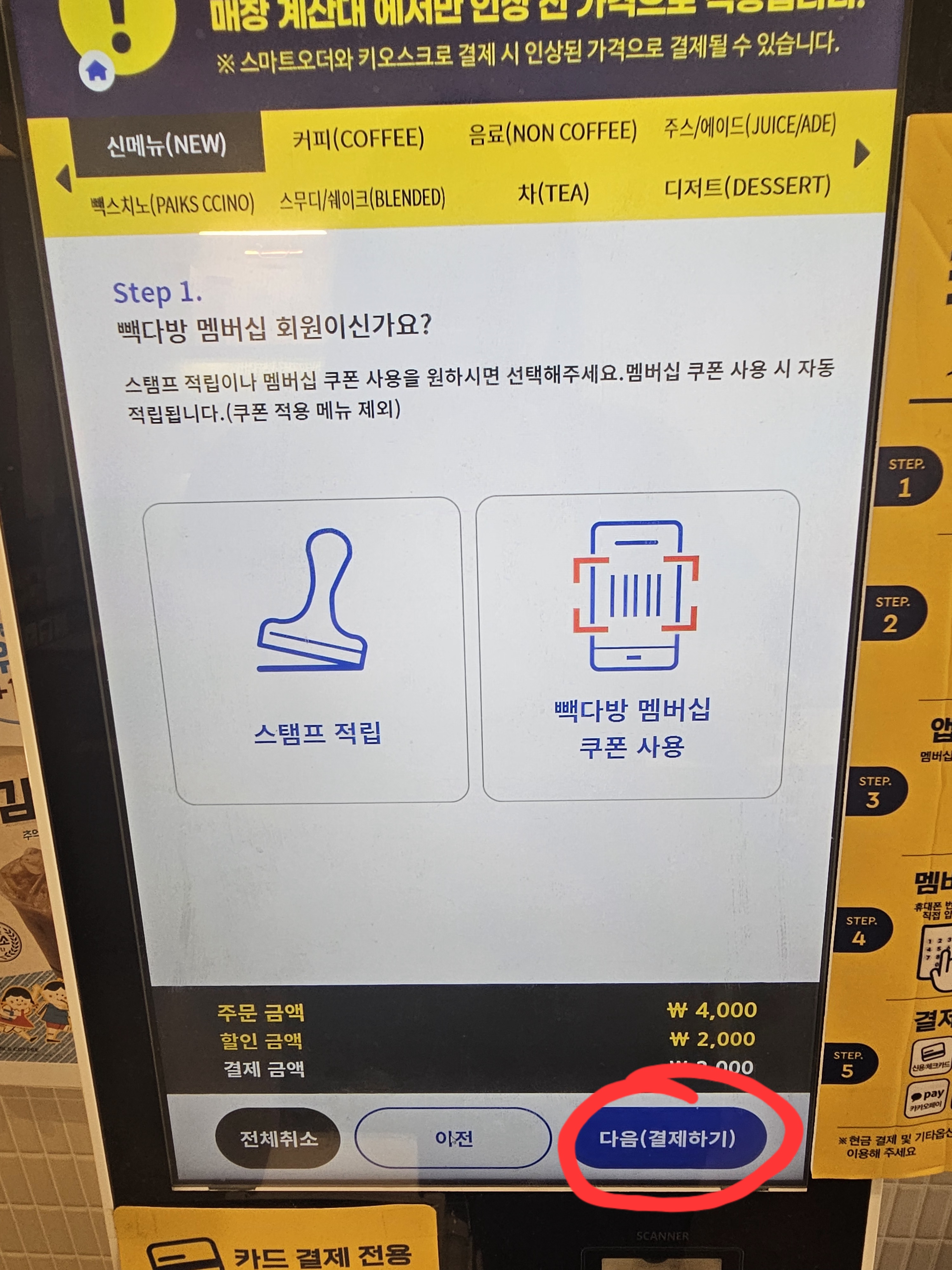 고른 4천원짜리 음료를 가지고 있던 아이스아메리카노 기프티콘을 사용해서 2천원 깍고 나머지는 카드 결제했습니다.
