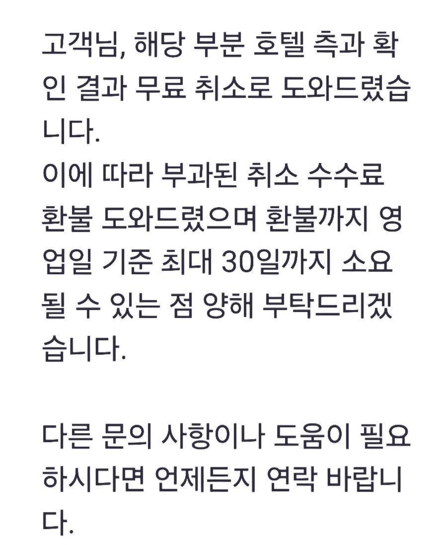 드디어 호텔에서 취소요금없이 취소해준다고 합니다.