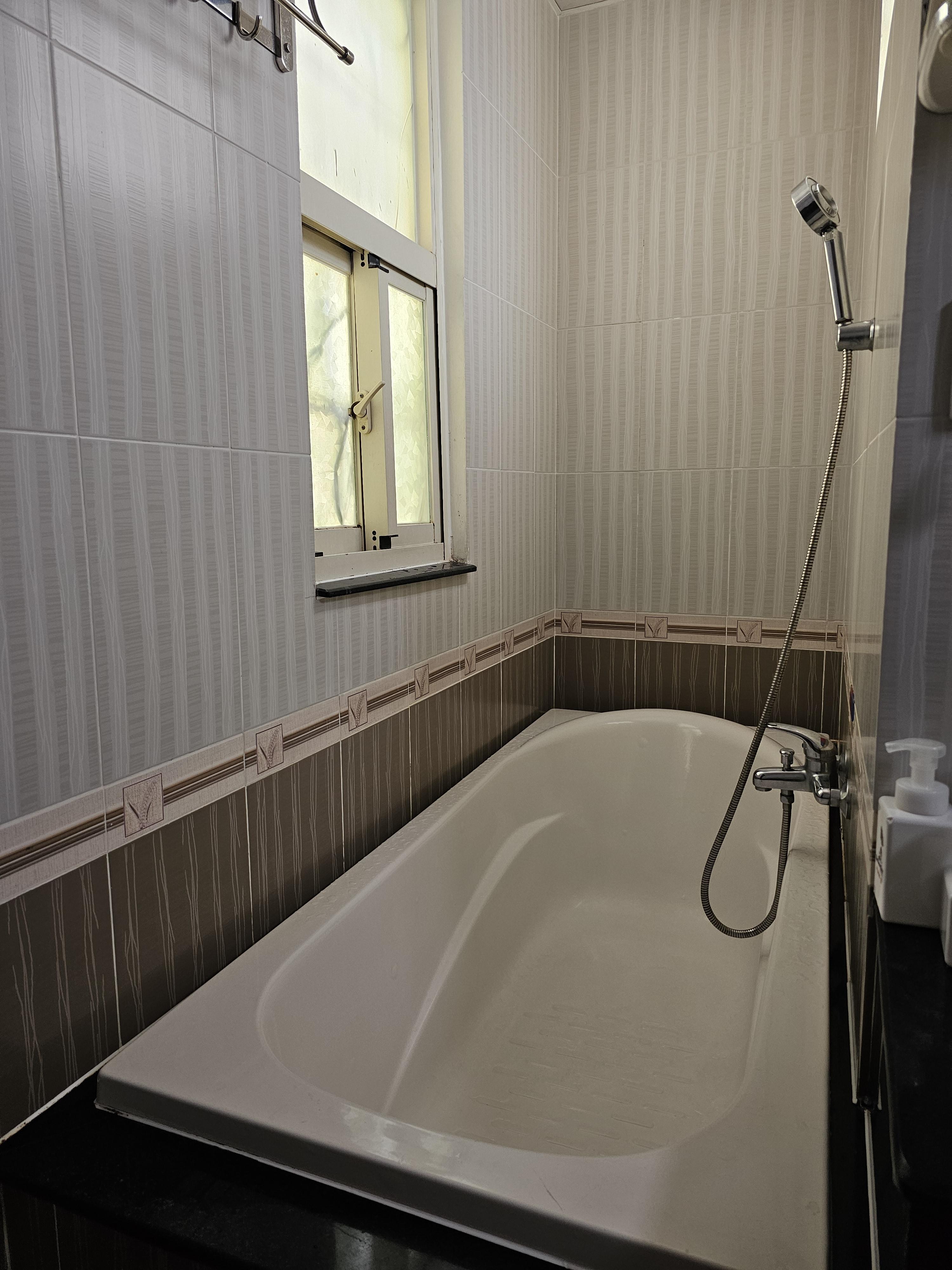 샤워기가 저기 하나밖에 없어서 무조건 욕조 안에서 샤워해야 했잖아😇 근데 욕조가 너무 높아서 들어갈 때랑 나올 때 미끄러질 뻔해서 겁났어. 한 번 미끄러질 뻔했음.. 개무서웠어.