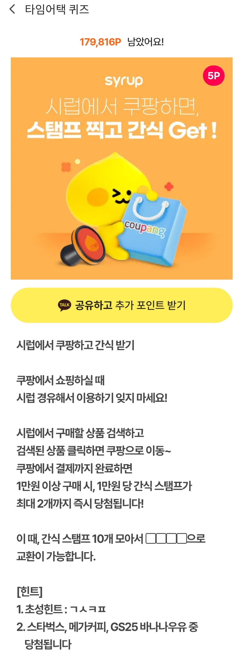 | 시럽 야금야금 타임어택 퀴즈 시럽에서 쿠팡하면 스탬프 찍고 스탬프 ㅇㅇ개 모으면 (2) | 2024.10.22 |