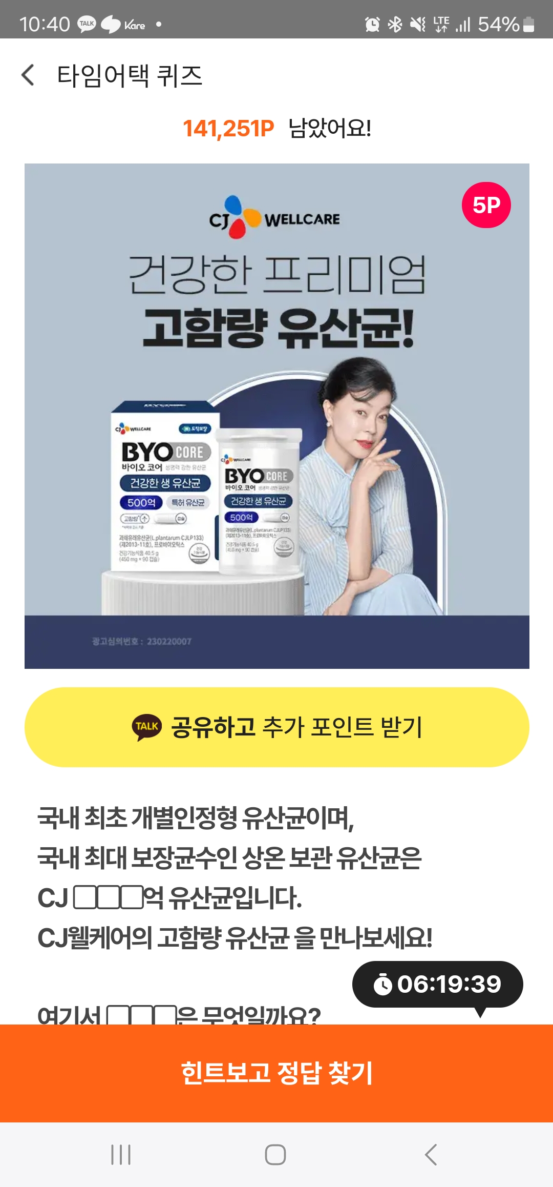CJ ▢▢▢억 유산균입니다.
