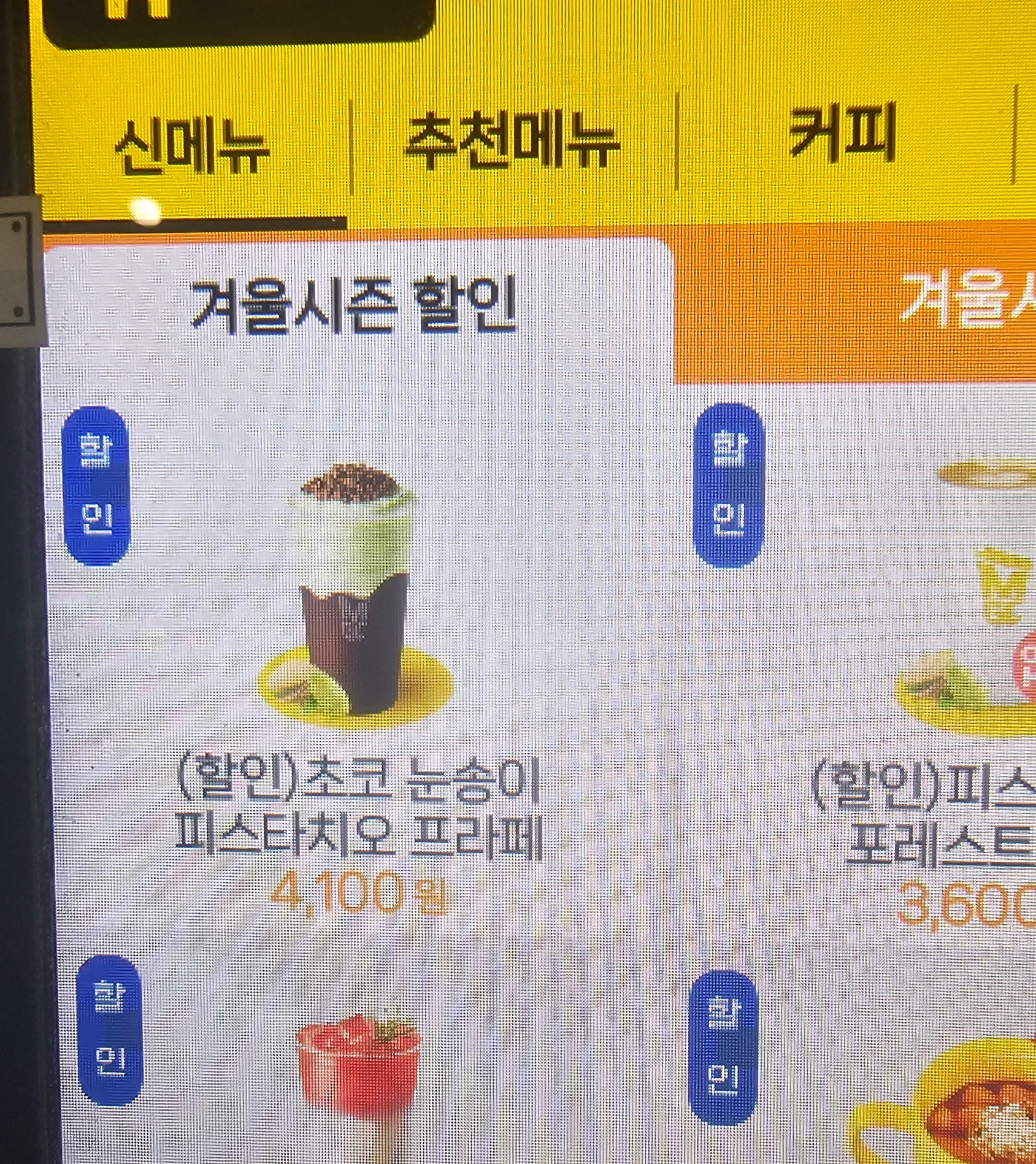 메가커피 겨울시즌 신상음료 초코 눈송이 피스타치오 프라페입니다.