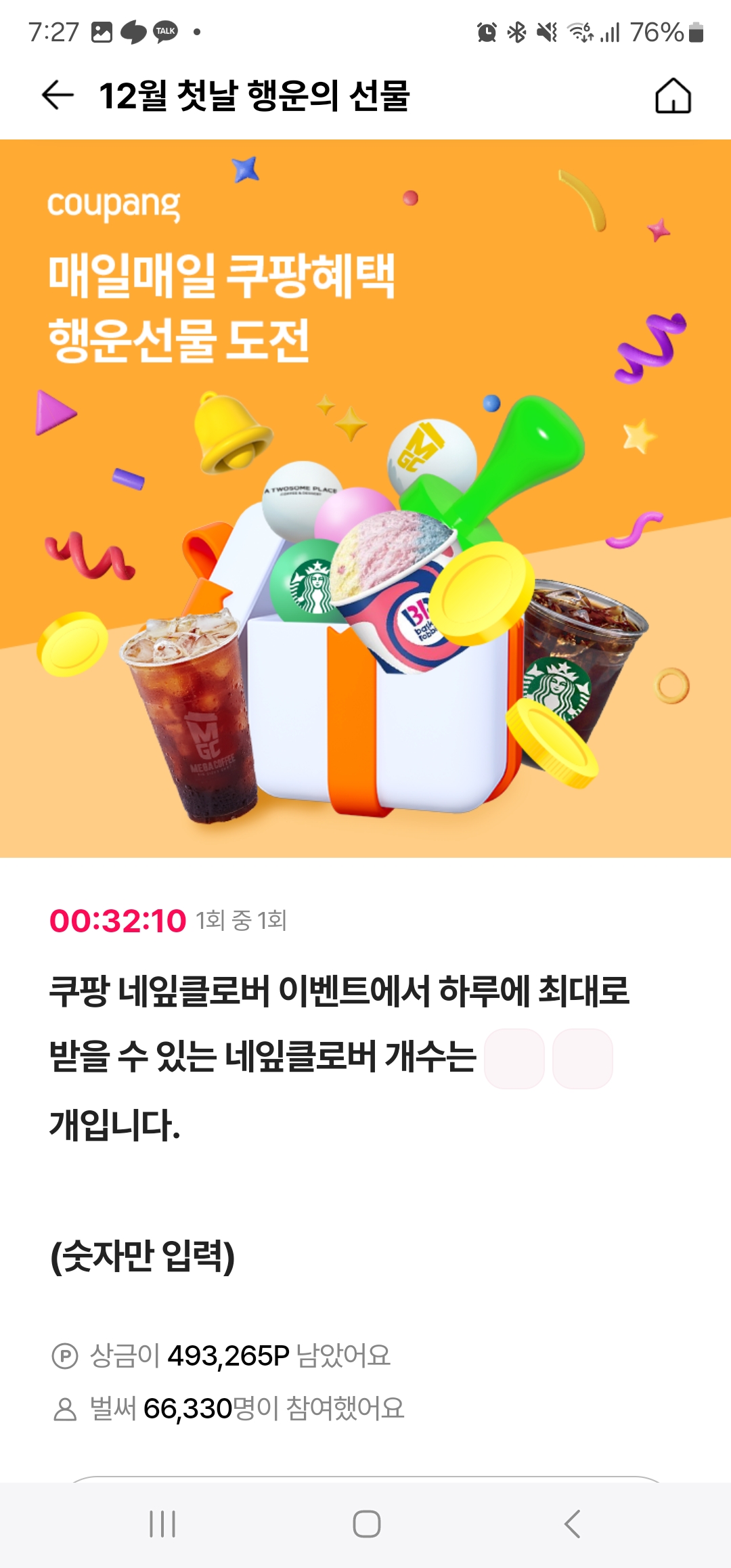 쿠팡 네잎클로버 이벤트에서 하루에 최대로 받을 수 있는 네잎클로버 개수는 ㅇㅇ개입니다.