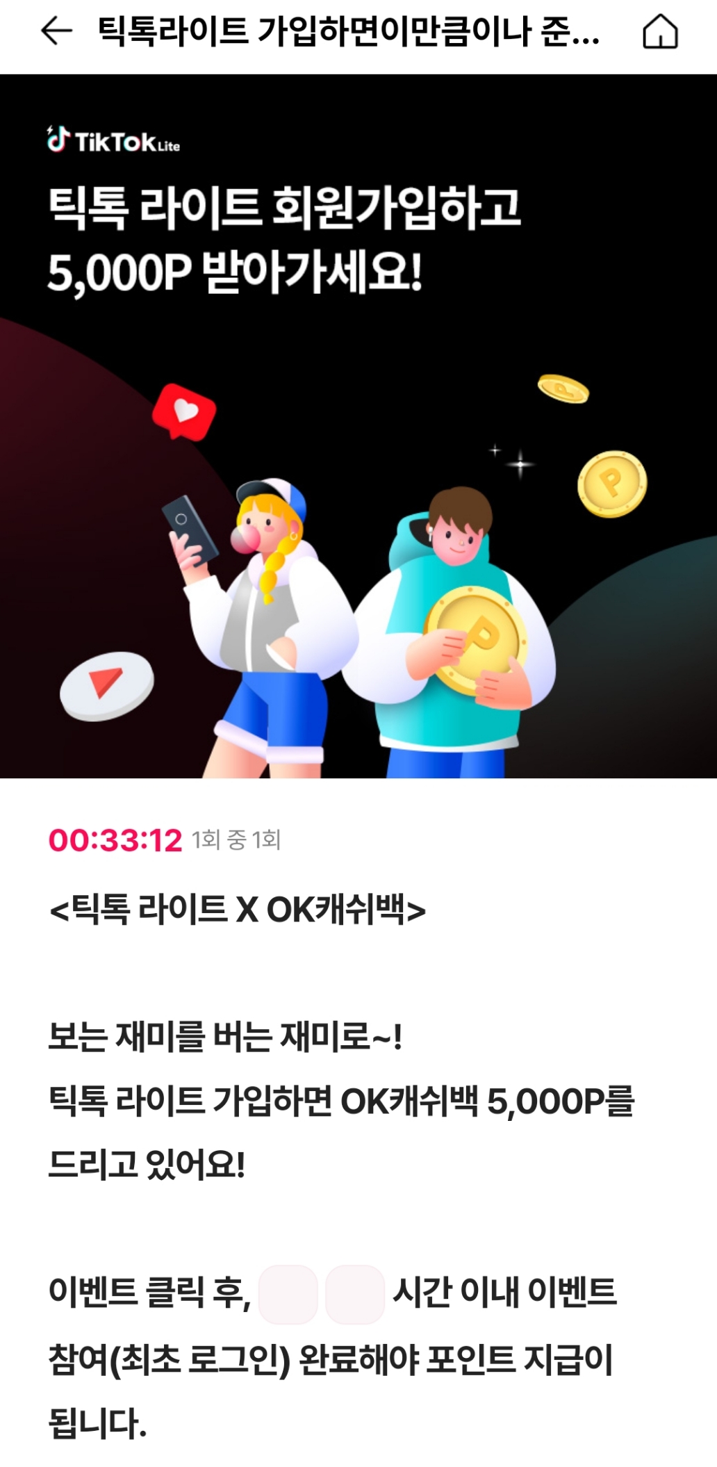 틱톡 라이트 가입하면 OK캐쉬백 5,000P를 드리고 있어요!