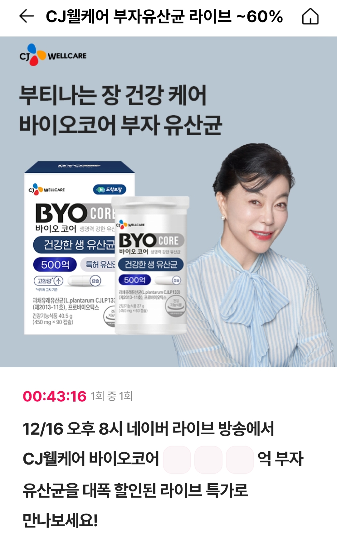 12/16 오후 8시 네이버 라이브 방송에서 CJ웰케어 바이오코어 ㅇㅇㅇ억 부자 유산균을 대폭 할인된 라이브 특가로 만나보세요!