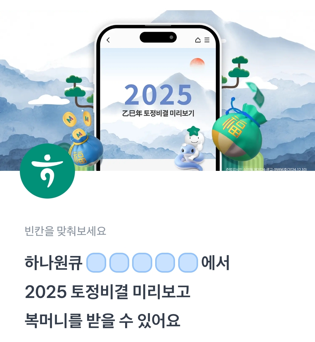 하나원큐 ㅎㄴㅇㅇㅅ에서 2025 토정비결 미리보고 복머니를 받을 수 있어요.