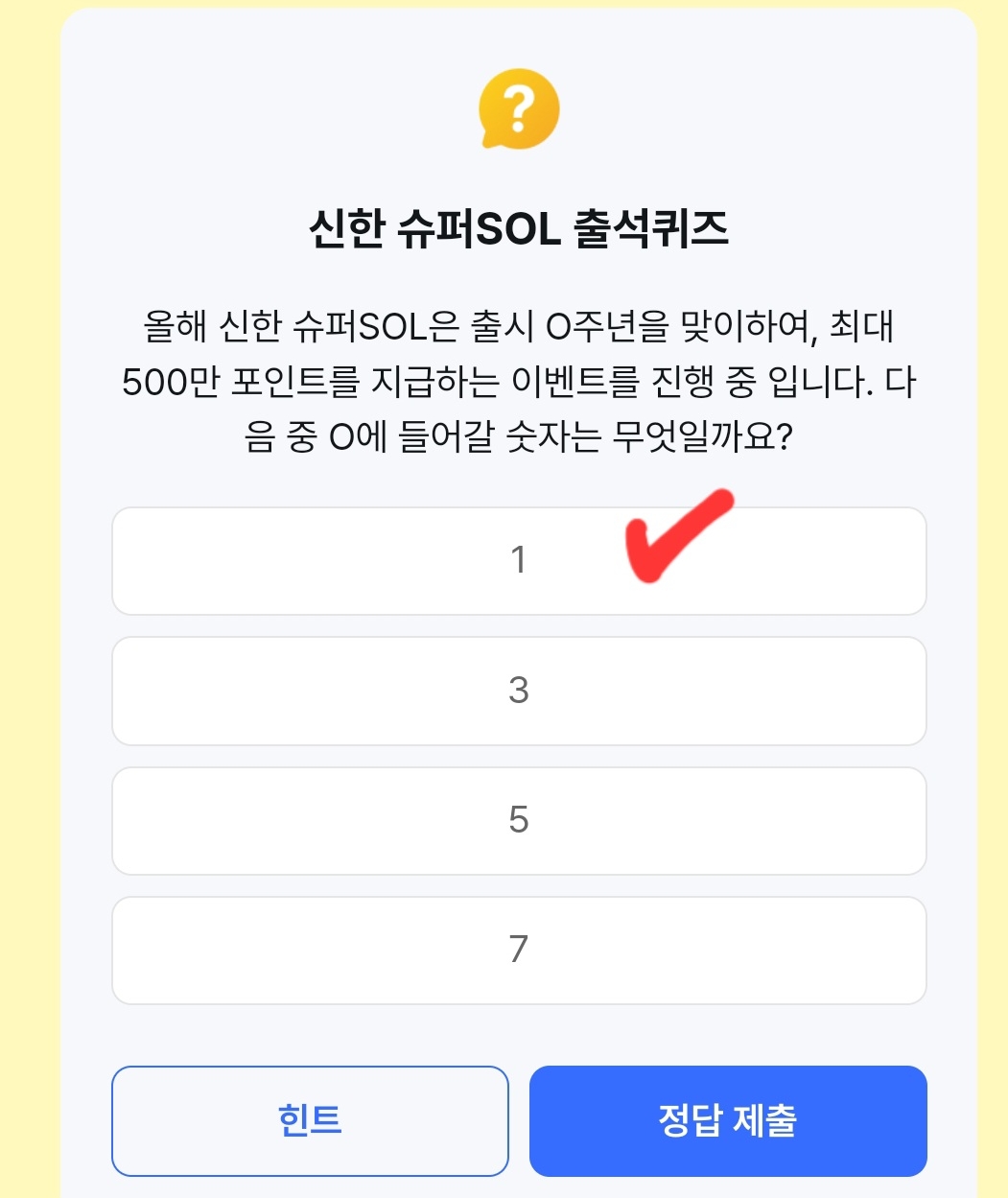 올해 신한 슈퍼SOL은 출시 주년을 맞이하여, 최대 500만 포인트를 지급하는 이벤트를 진행 중 입니다. 다음 중 0에 들어갈 숫자는 무엇일까요?