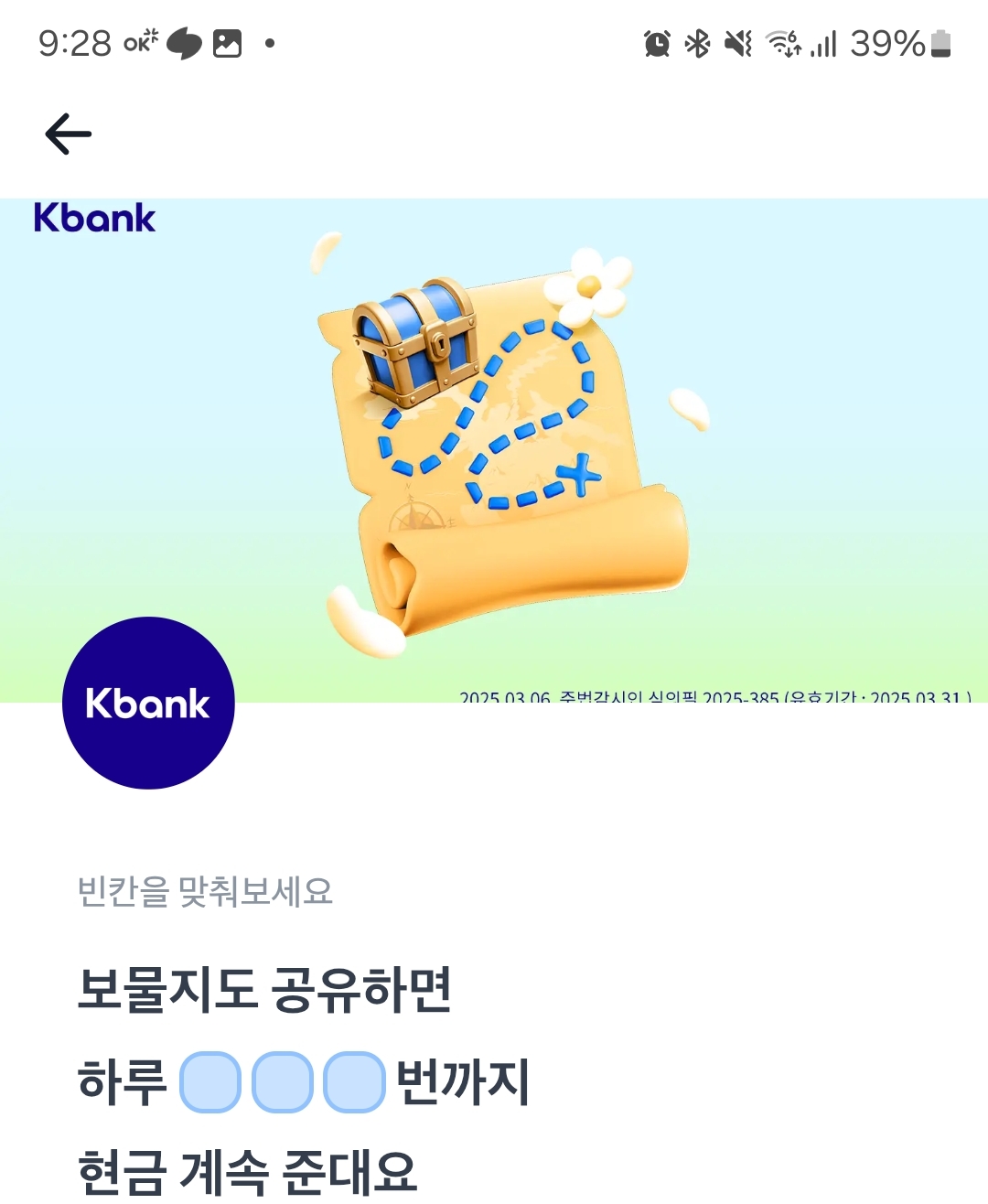 kbank 보물지도 공유하면 하루 ㅇㅇㅇ번까지 현금 계속 준대요