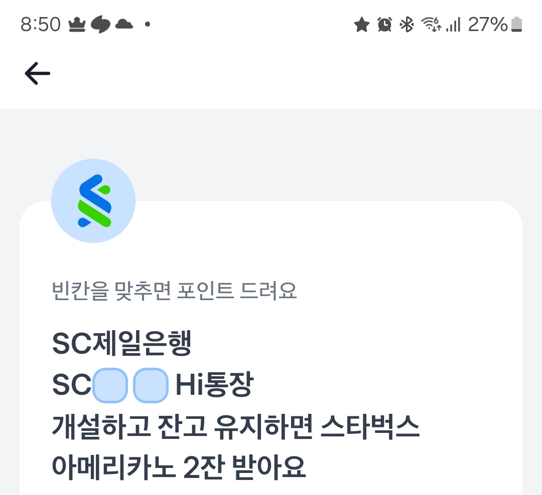 sc제일은행 sc ㅈㅇ hi통장 개설하고 잔고 유지하면 스타벅스 아메리카노 2잔 받아요.