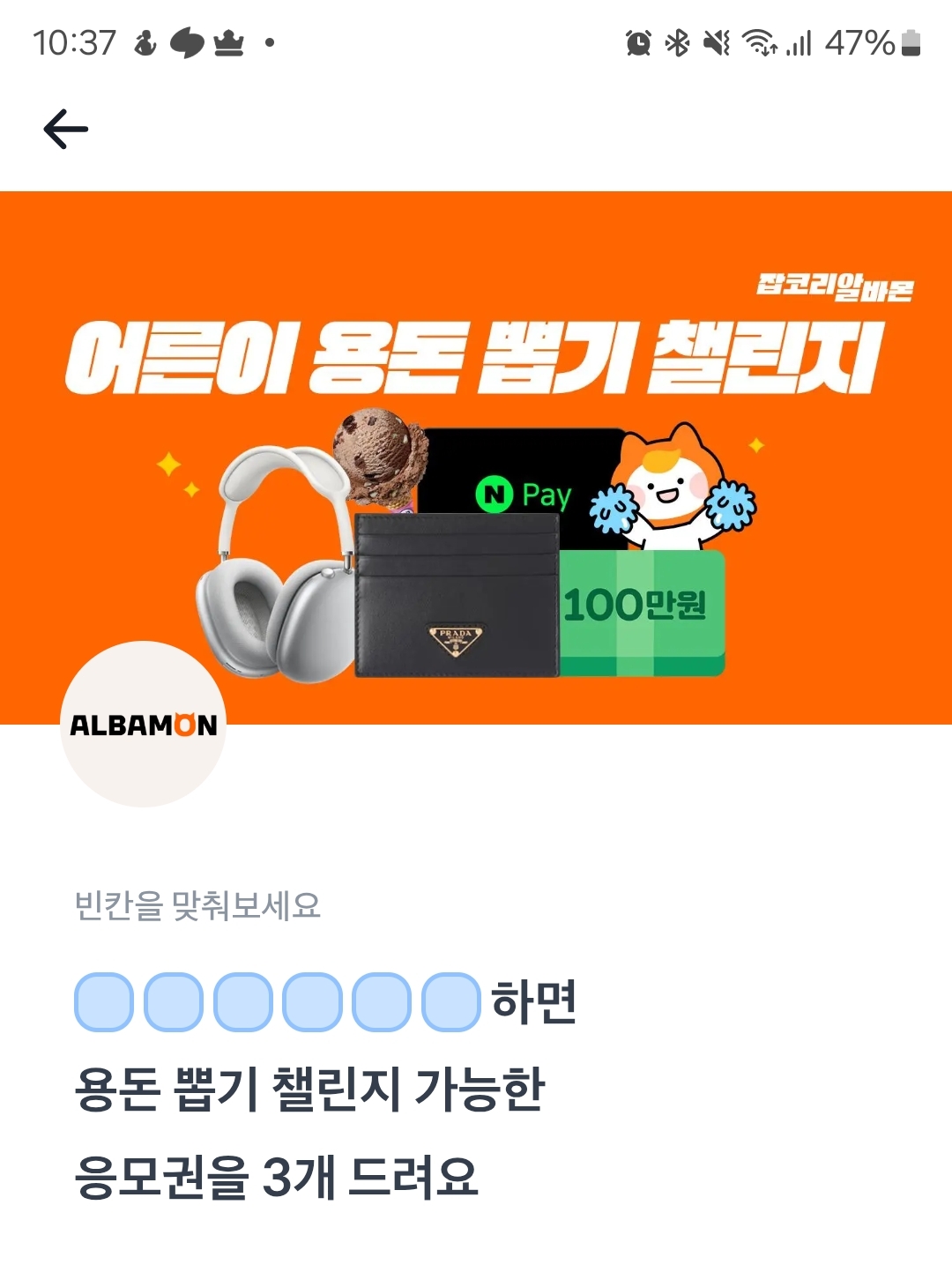 ㅈㅌㄱㄹㄷㄹ하면 용돈 뽑기 챌린지 가능한 응모권을 3개 드려요