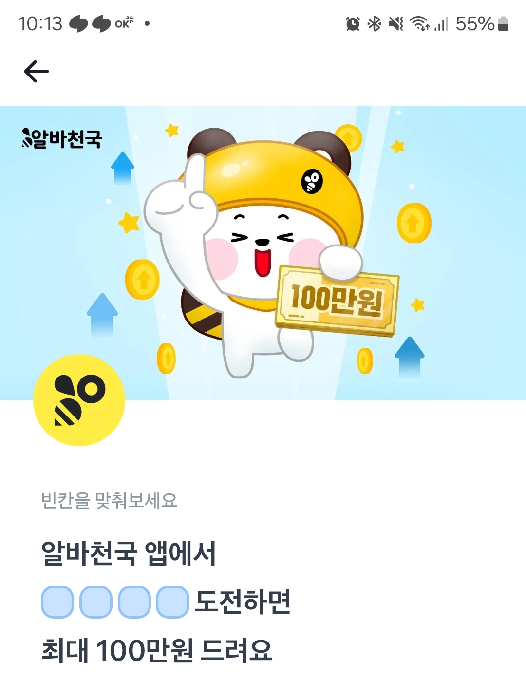 알바천국 앱에서 ㅇㅂㅁㅅ 도전하면 최대 100만원 드려요.