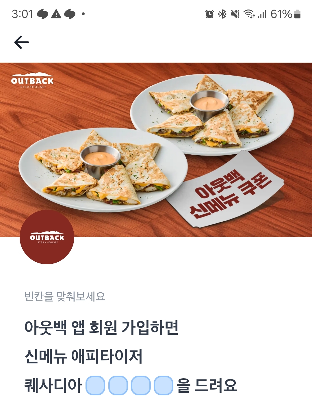 아웃백 앱 회원 가입하면 신메뉴 애피타이저 퀘사디아 ㅇㅋㅋㅍ을 드려요.