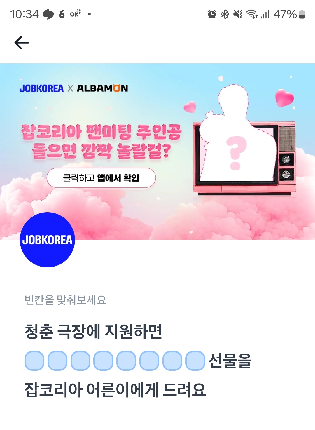 청춘 극장에 지원하면 ㅇㄹㅇㄹㅋㄷㄹㅇ 선물을 잡코리아 어른이에게 드려요.
