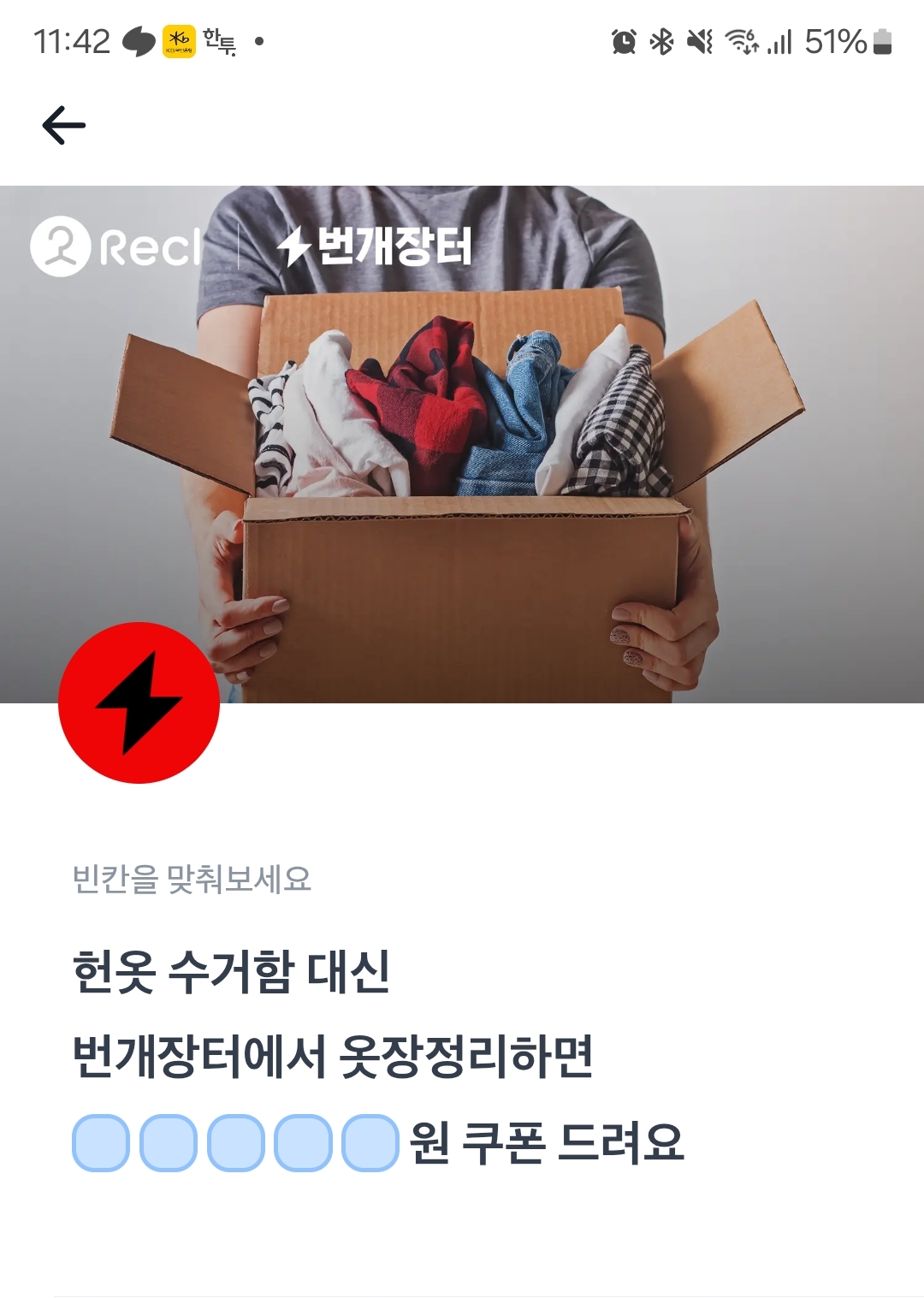 번개장터 헌옷 수거함 대신 번개장터에서 옷장정리하면 ㅇㅇㅇㅇㅇ원 쿠폰 드려요.