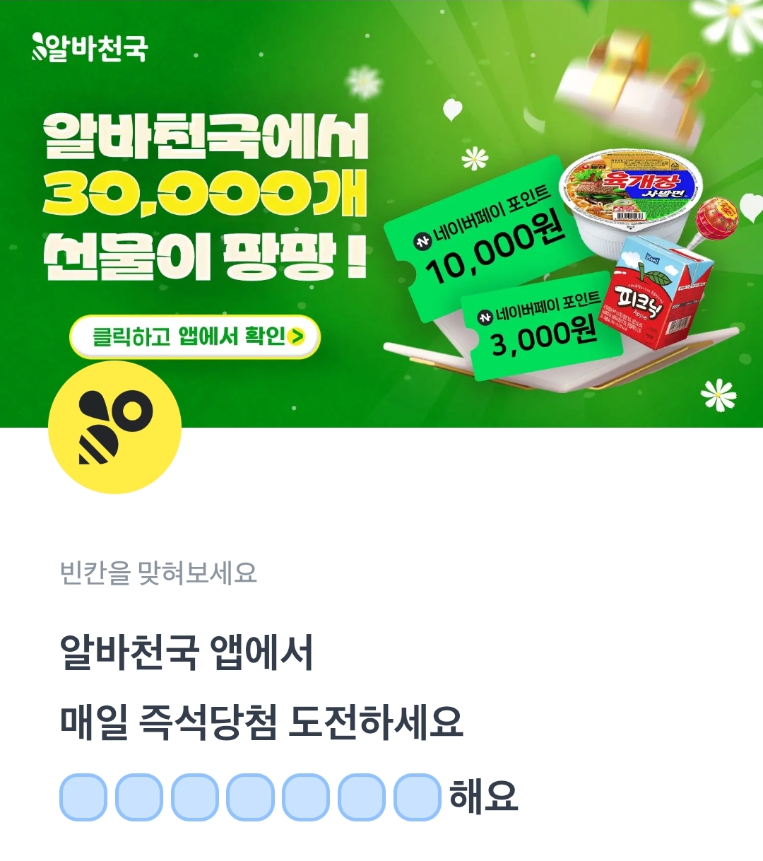 알바천국 앱에서 매일 즉석당첨 도전하세요. ㅇㄹㅂㄷㅊㄱㄴ해요.