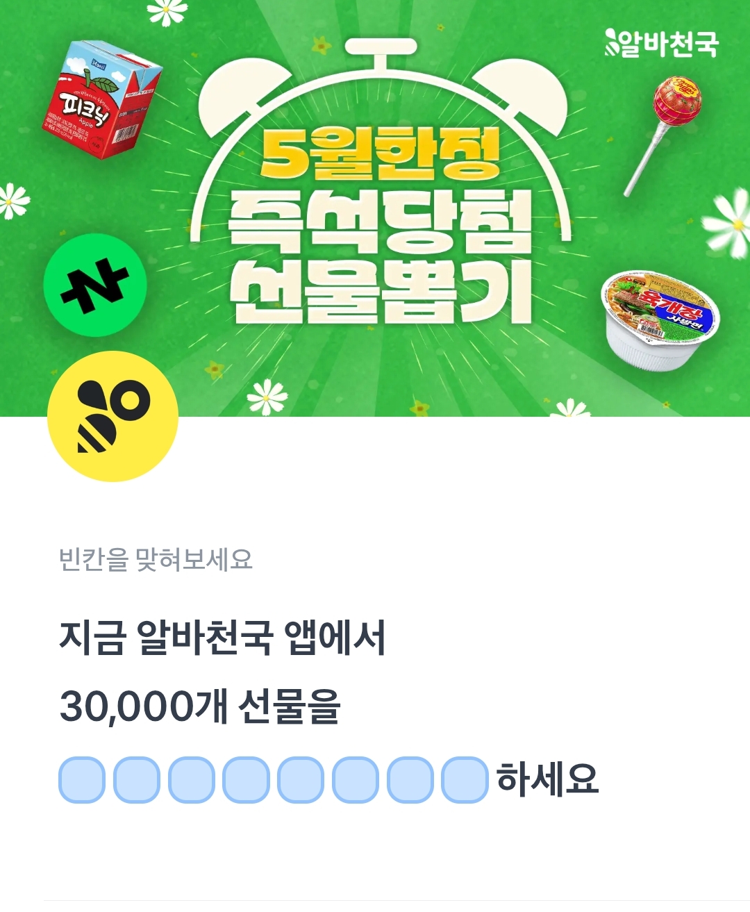 지금 알바천국 앱에서 30,000개 선물을 ㅁㅇㅈㅅㄷㅊㄷㅈ하세요