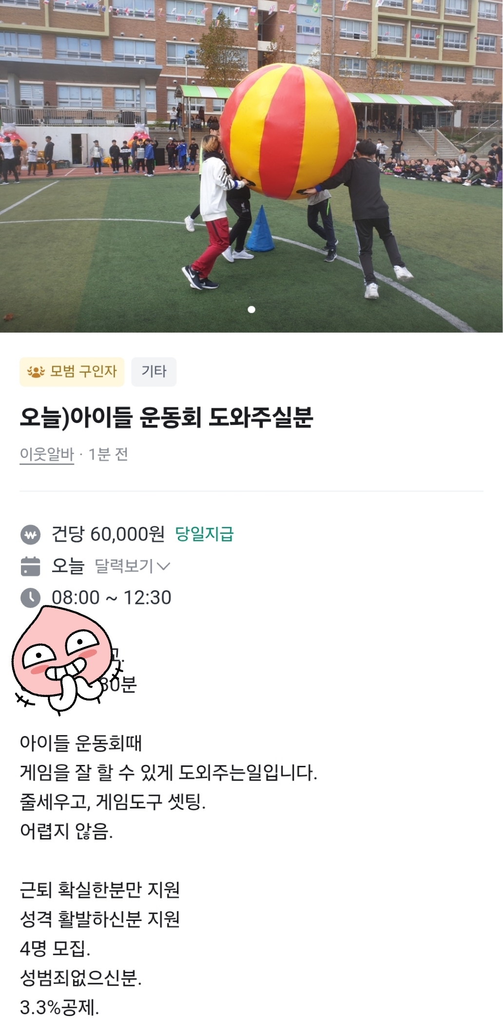 1분전에 올라온 게시글에 신청했음. 쉬고 싶은 마음, 일하고 싶은 마음이 공존해서 좀 고민했음. 30분거리인데 7시 기상이라서 그래도 할 수 있겠다 싶어서 ㄱㄱ