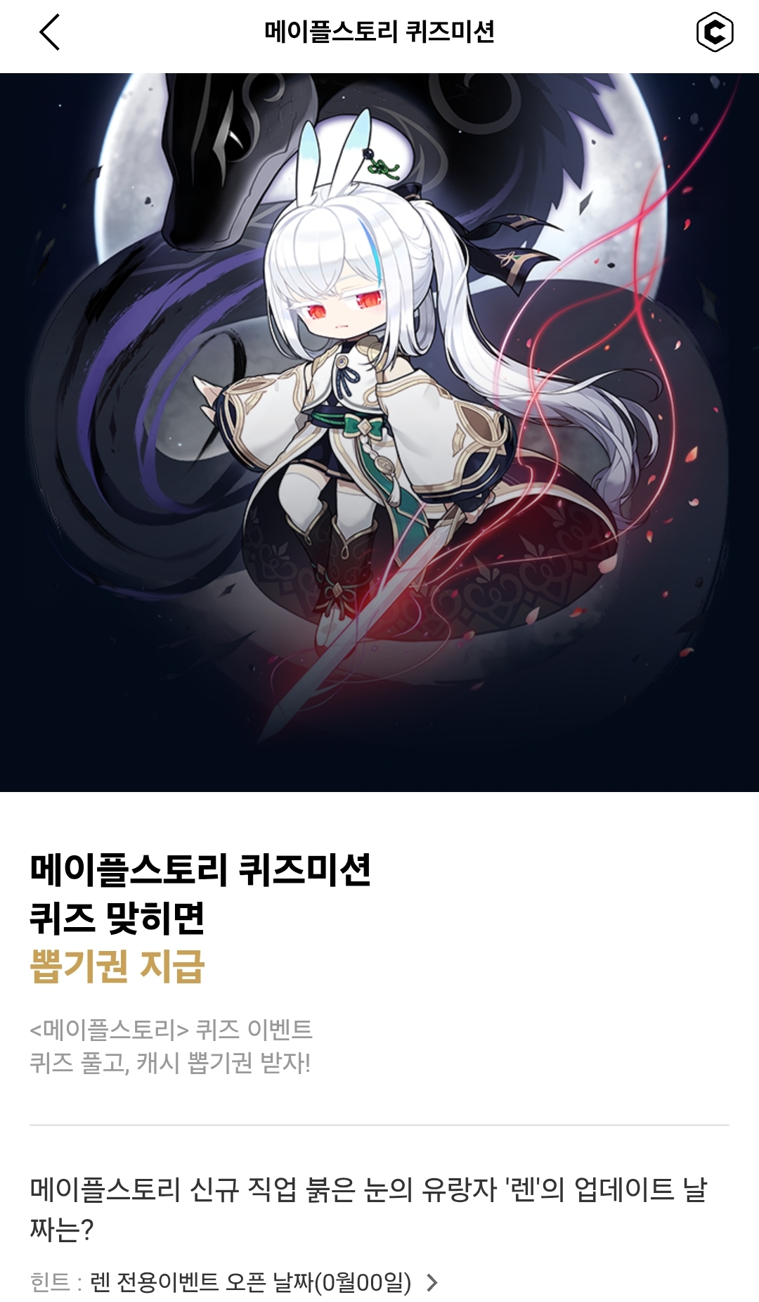 카카오페이지 메이플스토리 퀴즈미션 메이플스토리 신규 직업 붉은 눈의 유랑자 '렌'의 업데이트 날짜는?