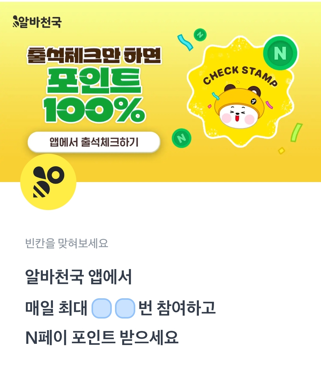 토스퀴즈 알바천국 앱에서 매일 최대 ㅇㅇ번 참여하구 N페이 포인트 받으세요.