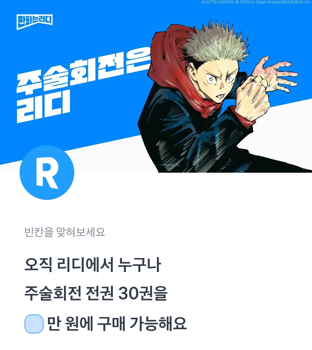 토퀴 토스퀴즈 오직 리디에서 누구나 주술회전 전권 30권을 ㅇ만 원에 구매가능해요