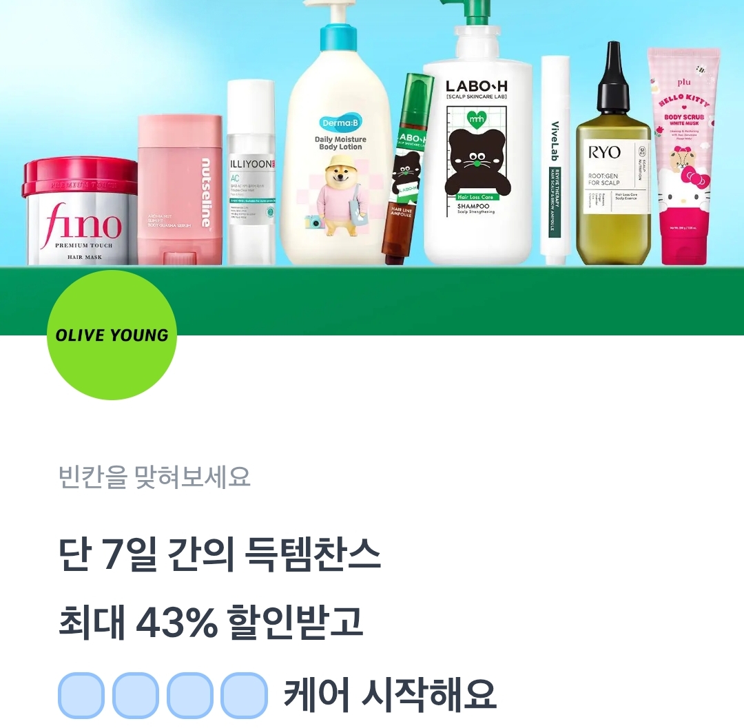 올리브영 단 7일 간의 득템찬스 최대 43% 할인받고 ㅎㅇㅂㄷ 케어 시작해요.