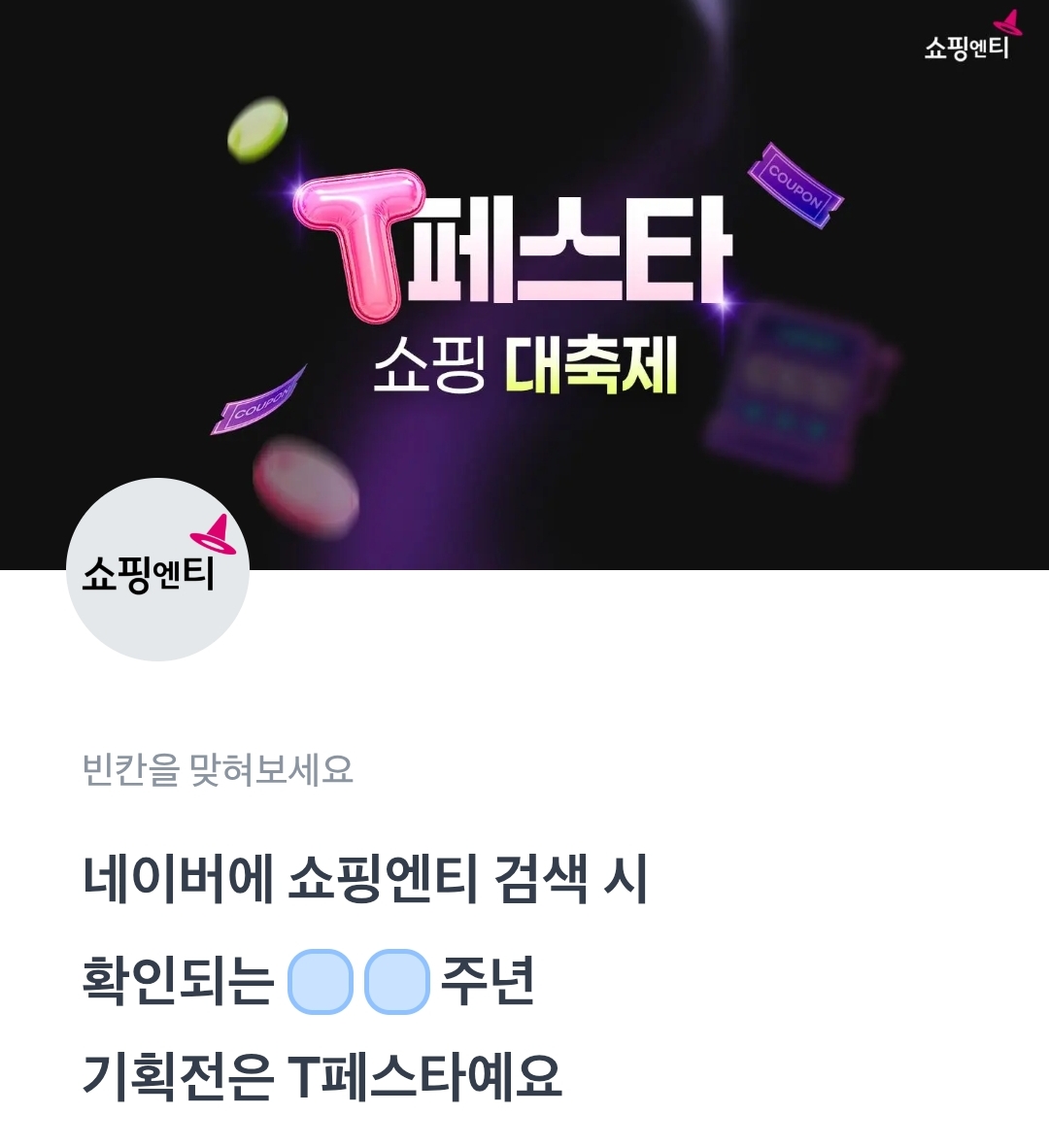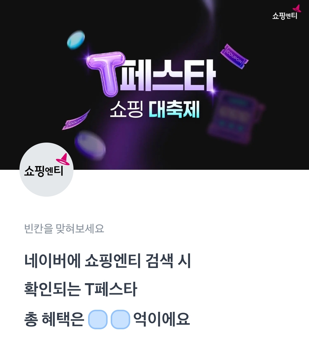 토퀴 토스퀴즈 네이버에 쇼핑엔티 검색 시 확인되는 T페스타 총 혜택은 ㅇㅇ억이에요.
