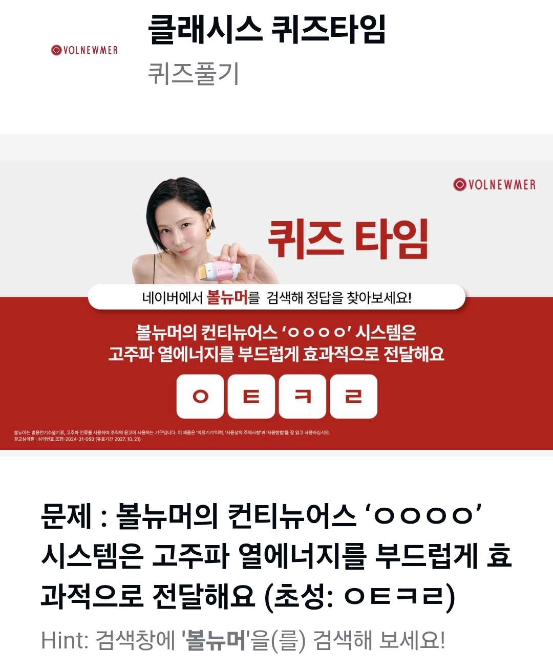문제 : 볼뉴머의 컨티뉴어스 ‘ㅇㅇㅇㅇ’ 시스템은 고주파 열에너지를 부드럽게 효과적으로 전달해요 (초성: ㅇㅌㅋㄹ)