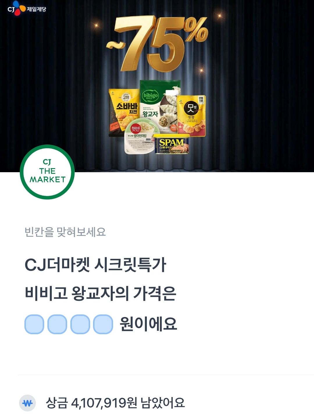 토스퀴즈 cj더마켓 시크릿특가 비비고 왕교자의 가격은 ㅇㅇㅇㅇ원이에요.