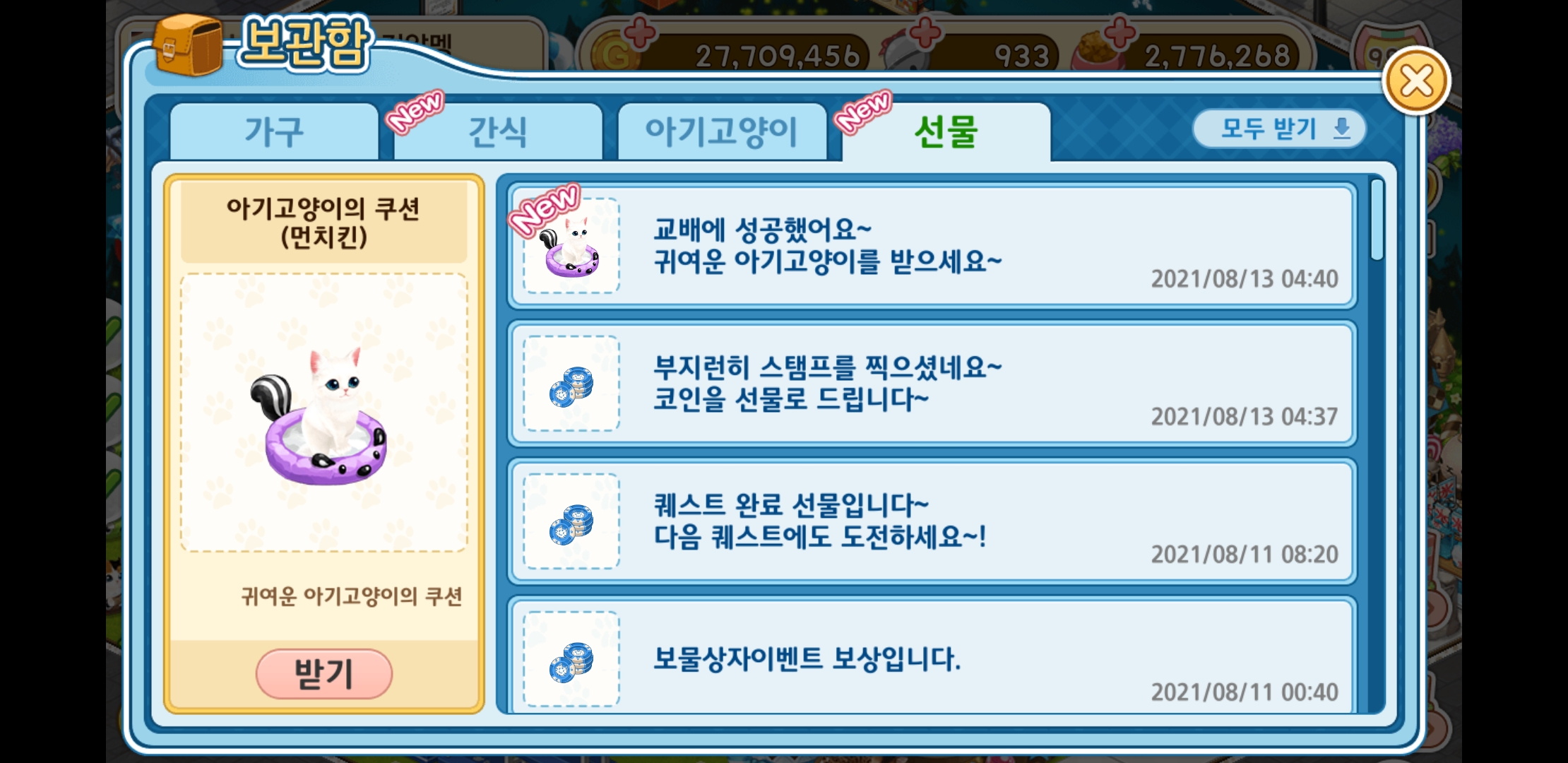 내가 접속안한지 1년이 넘었는데.. 신냥이 1개 뽑은거 시롸냐..ㅠㅠ